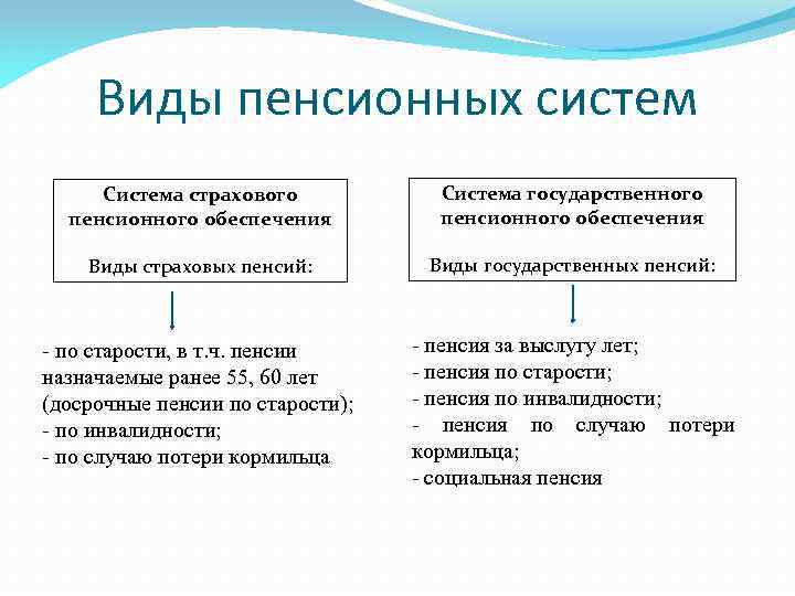 Виды пенсионных систем Система страхового пенсионного обеспечения Система государственного пенсионного обеспечения Виды страховых пенсий: Виды государственных пенсий: - по старости, в т. ч. пенсии назначаемые ранее 55, 60 лет (досрочные пенсии по старости); - по инвалидности; - по случаю потери кормильца - пенсия за выслугу лет; - пенсия по старости; - пенсия по инвалидности; - пенсия по случаю потери кормильца; - социальная пенсия