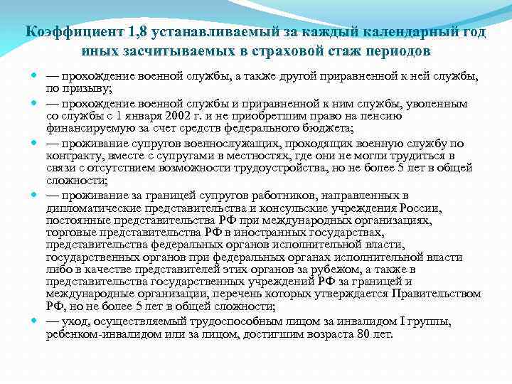 Коэффициент 1, 8 устанавливаемый за каждый календарный год иных засчитываемых в страховой стаж периодов — прохождение военной службы, а также другой приравненной к ней службы, по призыву; — прохождение военной службы и приравненной к ним службы, уволенным со службы с 1 января 2002 г. и не приобретшим право на пенсию финансируемую за счет средств федерального бюджета; — проживание супругов военнослужащих, проходящих военную службу по контракту, вместе с супругами в местностях, где они не могли трудиться в связи с отсутствием возможности трудоустройства, но не более 5 лет в общей сложности; — проживание за границей супругов работников, направленных в дипломатические представительства и консульские учреждения России, постоянные представительства РФ при международных организациях, торговые представительства РФ в иностранных государствах, представительства федеральных органов исполнительной власти, государственных органов при федеральных органах исполнительной власти либо в качестве представителей этих органов за рубежом, а также в представительства государственных учреждений РФ за границей и международные организации, перечень которых утверждается Правительством РФ, но не более 5 лет в общей сложности; — уход, осуществляемый трудоспособным лицом за инвалидом I группы, ребенком-инвалидом или за лицом, достигшим возраста 80 лет.