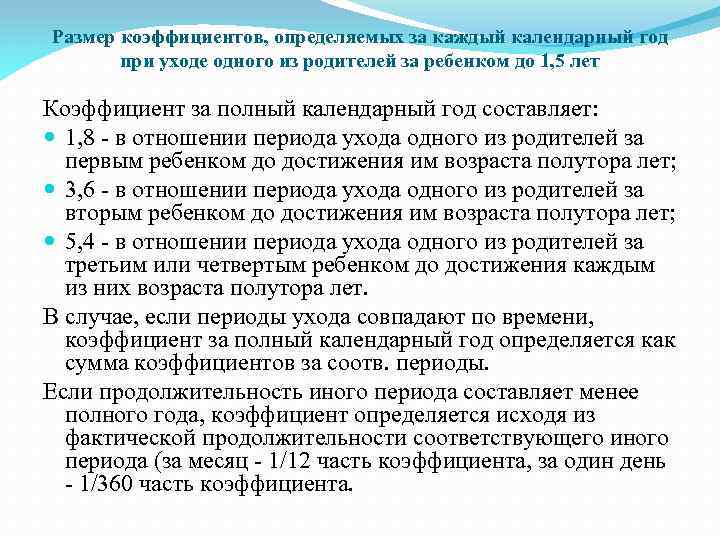 Размер коэффициентов, определяемых за каждый календарный год при уходе одного из родителей за ребенком до 1, 5 лет Коэффициент за полный календарный год составляет: 1, 8 - в отношении периода ухода одного из родителей за первым ребенком до достижения им возраста полутора лет; 3, 6 - в отношении периода ухода одного из родителей за вторым ребенком до достижения им возраста полутора лет; 5, 4 - в отношении периода ухода одного из родителей за третьим или четвертым ребенком до достижения каждым из них возраста полутора лет. В случае, если периоды ухода совпадают по времени, коэффициент за полный календарный год определяется как сумма коэффициентов за соотв. периоды. Если продолжительность иного периода составляет менее полного года, коэффициент определяется исходя из фактической продолжительности соответствующего иного периода (за месяц - 1/12 часть коэффициента, за один день - 1/360 часть коэффициента.
