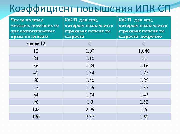 Коэффициент повышения ИПК СП Число полных месяцев, истекших со дня возникновения права на пенсию Кв. СП для лиц, которым назначается страховая пенсия по старости досрочно менее 12 12 24 36 48 60 72 84 96 108 120 1 1, 07 1, 15 1, 24 1, 34 1, 45 1, 59 1, 74 1, 9 2, 09 2, 32 1 1, 046 1, 16 1, 22 1, 29 1, 37 1, 45 1, 52 1, 68