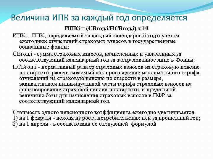Величина ИПК за каждый год определяется ИПКi = (СВгод, i/НСВгод, i) х 10 ИПКi - ИПК, определяемый за каждый календарный год с учетом ежегодных отчислений страховых взносов в государственные социальные фонды; СВгод, i - сумма страховых взносов, начисленных и уплаченных за соответствующий календарный год за застрахованное лицо в Фонды; НСВгод, i - нормативный размер страховых взносов на страховую пенсию по старости, рассчитываемый как произведение максимального тарифа отчислений на страховую пенсию по старости в размере, эквивалентном индивидуальной части тарифа страховых взносов на финансирование страховой пенсии по старости, и предельной величины базы для начисления страховых взносов в ПФР за соответствующий календарный год. Стоимость одного пенсионного коэффициента ежегодно увеличивается: 1) на 1 февраля - исходя из роста потребительских цен за прошедший год; 2) на 1 апреля - в соответствии со следующей формулой