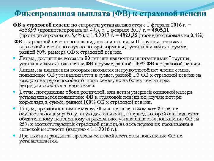 Фиксированная выплата (ФВ) к страховой пенсии ФВ к страховой пенсии по старости устанавливается с 1 февраля 2016 г. = 4558, 93 (проиндексирована на 4%), с 1 февраля 2017 г. = 4805, 11 (проиндексирована на 5, 4%), с 1. 4. 2017 г. = 4823, 35 (проиндексирована на 0, 4%) ФВ к страховой пенсии по инвалидности инвалидам III группы, а также к страховой пенсии по случаю потери кормильца устанавливается в сумме, равной 50% размера ФВ к страховой пенсии. Лицам, достигшим возраста 80 лет или являющимся инвалидами I группы, устанавливается повышение ФВ в сумме, равной 100% ФВ к страховой пенсии Лицам, на иждивении которых находятся нетрудоспособные члены семьи, повышение ФВ устанавливается в сумме, равной 1/3 ФВ к страховой пенсии на каждого нетрудоспособного члена семьи, но не более чем на трех нетрудоспособных членов семьи. Детям, потерявшим обоих родителей, или детям умершей одинокой матери устанавливается повышение ФВ к страховой пенсии по случаю потери кормильца в сумме, равной 100% ФВ к страховой пенсии. Лицам, проработавшим не менее 30 кал. лет в сельском хозяйстве, не осуществляющим работу, иную деятельность, в период которой они подлежат обязательному пенсионному страхованию, устанавливается повышение ФВ на 25% к соответствующей страховой пенсии, на весь период их проживания в сельской местности (введено с 1. 1. 2016 г. ). При выезде граждан за пределы сельской местности повышение ФВ не устанавливается.