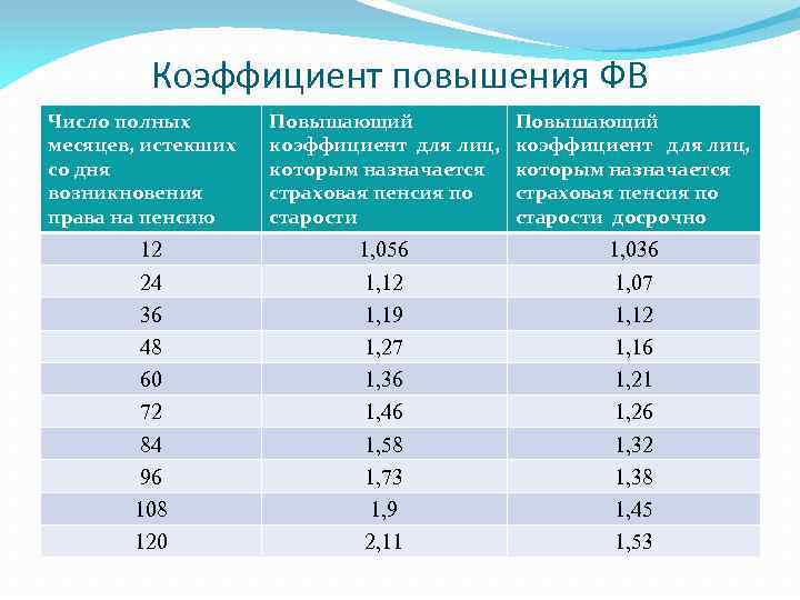 Коэффициент повышения ФВ Число полных месяцев, истекших со дня возникновения права на пенсию 12 24 36 48 60 72 84 96 108 120 Повышающий коэффициент для лиц, которым назначается страховая пенсия по старости досрочно 1, 056 1, 12 1, 19 1, 27 1, 36 1, 46 1, 58 1, 73 1, 9 2, 11 1, 036 1, 07 1, 12 1, 16 1, 21 1, 26 1, 32 1, 38 1, 45 1, 53
