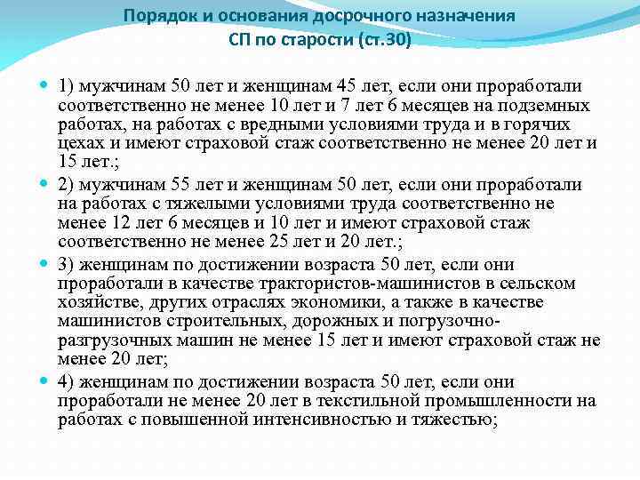 Порядок и основания досрочного назначения СП по старости (ст. 30) 1) мужчинам 50 лет и женщинам 45 лет, если они проработали соответственно не менее 10 лет и 7 лет 6 месяцев на подземных работах, на работах с вредными условиями труда и в горячих цехах и имеют страховой стаж соответственно не менее 20 лет и 15 лет. ; 2) мужчинам 55 лет и женщинам 50 лет, если они проработали на работах с тяжелыми условиями труда соответственно не менее 12 лет 6 месяцев и 10 лет и имеют страховой стаж соответственно не менее 25 лет и 20 лет. ; 3) женщинам по достижении возраста 50 лет, если они проработали в качестве трактористов-машинистов в сельском хозяйстве, других отраслях экономики, а также в качестве машинистов строительных, дорожных и погрузочноразгрузочных машин не менее 15 лет и имеют страховой стаж не менее 20 лет; 4) женщинам по достижении возраста 50 лет, если они проработали не менее 20 лет в текстильной промышленности на работах с повышенной интенсивностью и тяжестью;