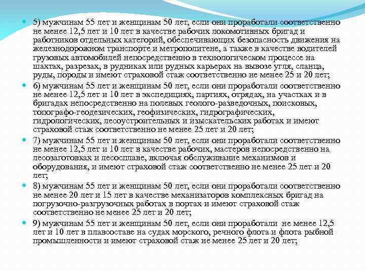 5) мужчинам 55 лет и женщинам 50 лет, если они проработали соответственно не менее 12, 5 лет и 10 лет в качестве рабочих локомотивных бригад и работников отдельных категорий, обеспечивающих безопасность движения на железнодорожном транспорте и метрополитене, а также в качестве водителей грузовых автомобилей непосредственно в технологическом процессе на шахтах, разрезах, в рудниках или рудных карьерах на вывозе угля, сланца, руды, породы и имеют страховой стаж соответственно не менее 25 и 20 лет; 6) мужчинам 55 лет и женщинам 50 лет, если они проработали соответственно не менее 12, 5 лет и 10 лет в экспедициях, партиях, отрядах, на участках и в бригадах непосредственно на полевых геолого-разведочных, поисковых, топографо-геодезических, геофизических, гидрографических, гидрологических, лесоустроительных и изыскательских работах и имеют страховой стаж соответственно не менее 25 лет и 20 лет; 7) мужчинам 55 лет и женщинам 50 лет, если они проработали соответственно не менее 12, 5 лет и 10 лет в качестве рабочих, мастеров непосредственно на лесозаготовках и лесосплаве, включая обслуживание механизмов и оборудования, и имеют страховой стаж соответственно не менее 25 лет и 20 лет; 8) мужчинам 55 лет и женщинам 50 лет, если они проработали соответственно не менее 20 лет и 15 лет в качестве механизаторов комплексных бригад на погрузочно-разгрузочных работах в портах и имеют страховой стаж соответственно не менее 25 лет и 20 лет; 9) мужчинам 55 лет и женщинам 50 лет, если они проработали не менее 12, 5 лет и 10 лет в плавсоставе на судах морского, речного флота и флота рыбной промышленности и имеют страховой стаж не менее 25 лет и 20 лет;