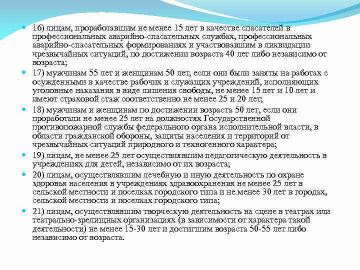 16) лицам, проработавшим не менее 15 лет в качестве спасателей в профессиональных аварийно-спасательных службах, профессиональных аварийно-спасательных формированиях и участвовавшим в ликвидации чрезвычайных ситуаций, по достижении возраста 40 лет либо независимо от возраста; 17) мужчинам 55 лет и женщинам 50 лет, если они были заняты на работах с осужденными в качестве рабочих и служащих учреждений, исполняющих уголовные наказания в виде лишения свободы, не менее 15 лет и 10 лет и имеют страховой стаж соответственно не менее 25 и 20 лет; 18) мужчинам и женщинам по достижении возраста 50 лет, если они проработали не менее 25 лет на должностях Государственной противопожарной службы федерального органа исполнительной власти, в области гражданской обороны, защиты населения и территорий от чрезвычайных ситуаций природного и техногенного характера; 19) лицам, не менее 25 лет осуществлявшим педагогическую деятельность в учреждениях для детей, независимо от их возраста; 20) лицам, осуществлявшим лечебную и иную деятельность по охране здоровья населения в учреждениях здравоохранения не менее 25 лет в сельской местности и поселках городского типа и не менее 30 лет в городах, сельской местности и поселках городского типа; 21) лицам, осуществлявшим творческую деятельность на сцене в театрах или театрально-зрелищных организациях (в зависимости от характера такой деятельности) не менее 15 -30 лет и достигшим возраста 50 -55 лет либо независимо от возраста.