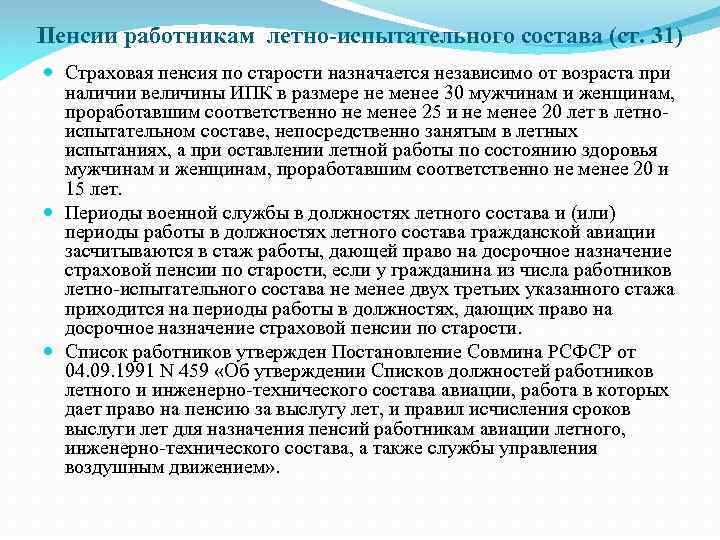 Пенсии работникам летно-испытательного состава (ст. 31) Страховая пенсия по старости назначается независимо от возраста при наличии величины ИПК в размере не менее 30 мужчинам и женщинам, проработавшим соответственно не менее 25 и не менее 20 лет в летноиспытательном составе, непосредственно занятым в летных испытаниях, а при оставлении летной работы по состоянию здоровья мужчинам и женщинам, проработавшим соответственно не менее 20 и 15 лет. Периоды военной службы в должностях летного состава и (или) периоды работы в должностях летного состава гражданской авиации засчитываются в стаж работы, дающей право на досрочное назначение страховой пенсии по старости, если у гражданина из числа работников летно-испытательного состава не менее двух третьих указанного стажа приходится на периоды работы в должностях, дающих право на досрочное назначение страховой пенсии по старости. Список работников утвержден Постановление Совмина РСФСР от 04. 09. 1991 N 459 «Об утверждении Списков должностей работников летного и инженерно-технического состава авиации, работа в которых дает право на пенсию за выслугу лет, и правил исчисления сроков выслуги лет для назначения пенсий работникам авиации летного, инженерно-технического состава, а также службы управления воздушным движением» .