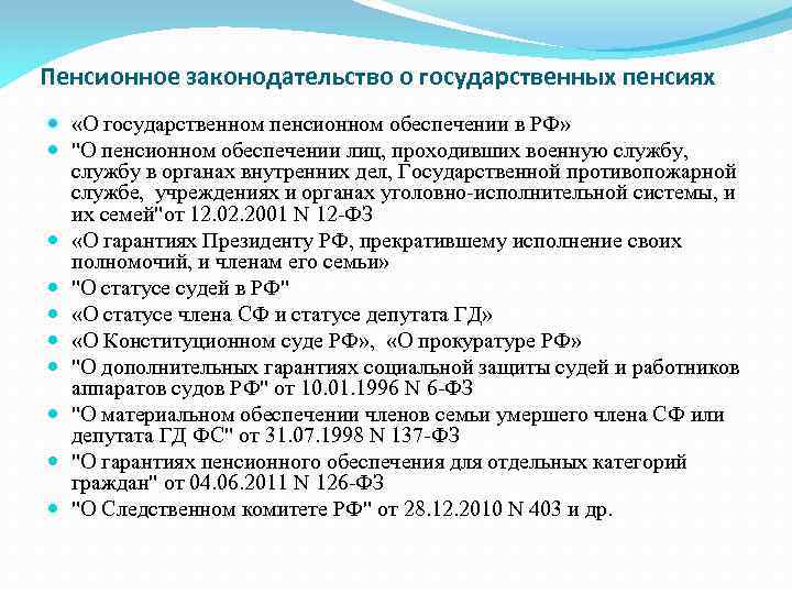 Пенсионное законодательство о государственных пенсиях «О государственном пенсионном обеспечении в РФ» "О пенсионном обеспечении лиц, проходивших военную службу, службу в органах внутренних дел, Государственной противопожарной службе, учреждениях и органах уголовно-исполнительной системы, и их семей"от 12. 02. 2001 N 12 -ФЗ «О гарантиях Президенту РФ, прекратившему исполнение своих полномочий, и членам его семьи» "О статусе судей в РФ" «О статусе члена СФ и статусе депутата ГД» «О Конституционном суде РФ» , «О прокуратуре РФ» "О дополнительных гарантиях социальной защиты судей и работников аппаратов судов РФ" от 10. 01. 1996 N 6 -ФЗ "О материальном обеспечении членов семьи умершего члена СФ или депутата ГД ФС" от 31. 07. 1998 N 137 -ФЗ "О гарантиях пенсионного обеспечения для отдельных категорий граждан" от 04. 06. 2011 N 126 -ФЗ "О Следственном комитете РФ" от 28. 12. 2010 N 403 и др.
