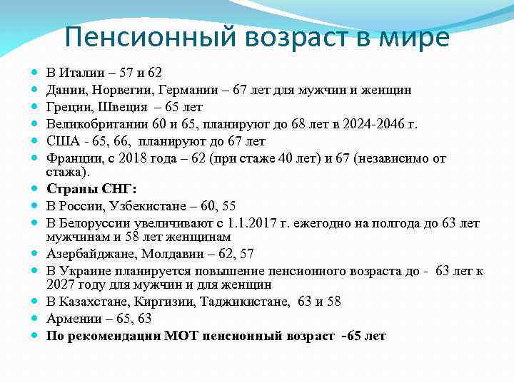 Пенсионный возраст в мире В Италии – 57 и 62 Дании, Норвегии, Германии – 67 лет для мужчин и женщин Греции, Швеция – 65 лет Великобритании 60 и 65, планируют до 68 лет в 2024 -2046 г. США - 65, 66, планируют до 67 лет Франции, с 2018 года – 62 (при стаже 40 лет) и 67 (независимо от стажа). Страны СНГ: В России, Узбекистане – 60, 55 В Белоруссии увеличивают с 1. 1. 2017 г. ежегодно на полгода до 63 лет мужчинам и 58 лет женщинам Азербайджане, Молдавии – 62, 57 В Украине планируется повышение пенсионного возраста до - 63 лет к 2027 году для мужчин и для женщин В Казахстане, Киргизии, Таджикистане, 63 и 58 Армении – 65, 63 По рекомендации МОТ пенсионный возраст -65 лет