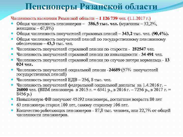 Пенсионеры Рязанской области Численность населения Рязанской области – 1 126 739 чел. (1. 1. 2017 г. ) Общая численность пенсионеров – 386, 5 тыс. чел. (мужчины – 32, 2%, женщины – 67, 8%) Общая численность получателей страховых пенсий – 343, 2 тыс. чел. (90, 4%). Общая численность получателей пенсий по государственному пенсионному обеспечению – 43, 3 тыс. чел. Численность получателей страховой пенсии по старости - 282547 чел. Численность получателей страховой пенсии по инвалидности - 34 491 чел. Численность получателей страховой пенсии по случаю потери кормильца - 13 024 чел. Численность получателей социальной пенсии -24689 (57% получателей государственных пенсий) Численность получателей ЕДВ – 256, 8 тыс. чел. Численность получателей федеральной социальной доплаты на 1. 4. 2016 г. – 26000 чел. (ВПМ пенсионера в 2015 г. = 6341 р. , в 2016 г. – 7256 р. , в 2017 г. = 8456 р. ) Повышенную ФВ получают 45192 пенсионера, достигшие возраста 80 лет 63 пенсионера старше 100 лет, самому старшему 106 лет. Количество работающих пенсионеров - 87, 8 тыс. человек, или 22, 7% от общей численности пенсионеров.