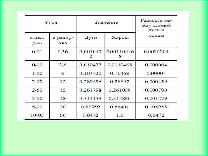 3. 2 УМОВИ Й ПОРЯДОК ОБЛІКУ ПЯТИПРОЦЕНТНОЇ ПОПРАВКИ. ПРИ ВЫВОДЕ ФОРМУЛЫ (1. 2) БЫЛО ЗДЕЛАНО ДВА ДОПУЩЕНИЯ: а ) длина дуги, соответствующая центральному углу из n делений угломера, принята равной длине стягивающей ее хорды ; б ) длина дуги , соответствующая углу в одно деление угломера , принята равной Д : 1000, а требуется Д : 955. Проанализируем влияние сделанных допущений по таблице 1. 3, где приведены результаты расчетов значении дуг и хорд , выраженных в радиусах окружности.
