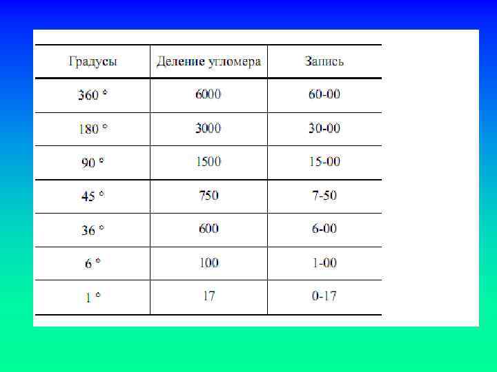 1. 2 РОЗПОДІЛ КУТОМІРА, ЙОГО СУТЬ. ДЕЛЕНИЕМ УГЛОМЕРА (РОЗПОДІЛОМ КУТОМІРА) НАЗЫВАЕТСЯ ЦЕНТРАЛЬНЫЙ УГОЛ, ОПИРАЮЩИЙСЯ НА ДУГУ РАВНУЮ 1/6000 ЧАСТИ ДЛИНЫ ОКРУЖНОСТИ. ДЛЯ ЗРУЧНОСТІ УСНОЇ ПЕРЕДАЧІ ВЕЛИЧИНИ КУТА В РОЗПОДІЛАХ КУТОМІРА ПРОІЗНОСИТЬСЯ РОЗДІЛЬНО. ЦЕЙ ПРИЙОМ ВИКОРИСТОВУЄТЬСЯ І ДЛЯ ЗАПИСУ (табл. 1. 1).