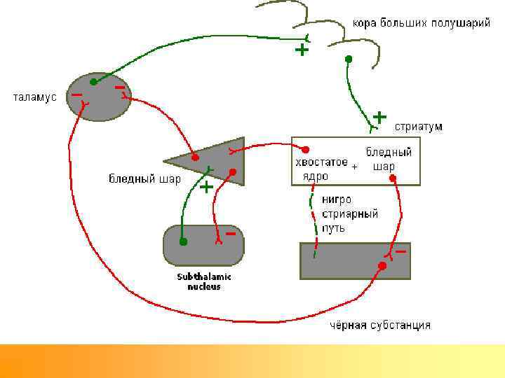 Ряд подкорковых структур получает тормозные влияния со стороны хвостатого ядра • Таламус • Бледный шар • Субталамическое ядро • Черная субстанция