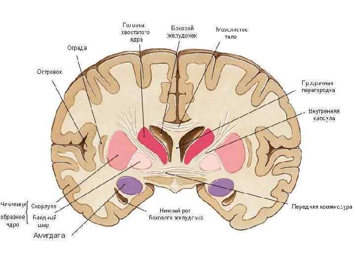 Амигдала • Миндалевидный комплекс крупное ядерное образование (у человека около 10 х 8 х 5 мм), расположенное в глубине передней части височной доли над ростральным отделом нижнего рога бокового желудочка.