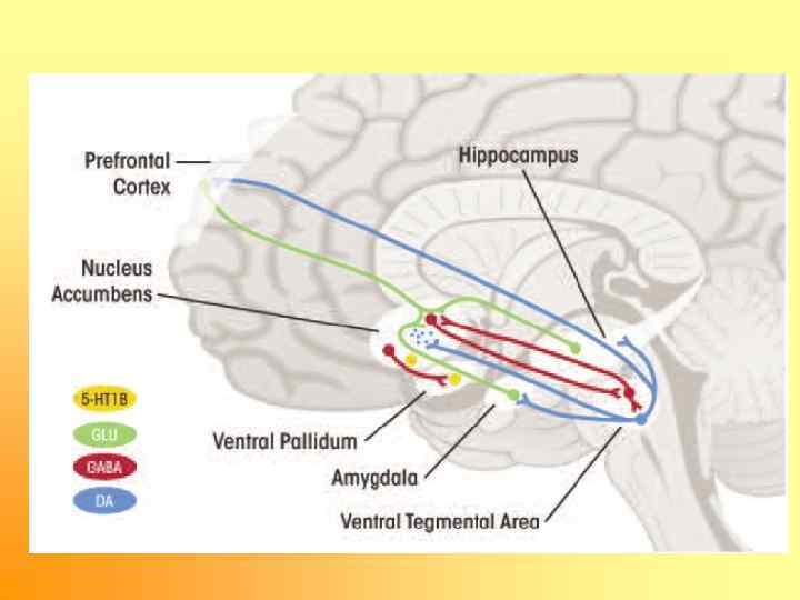 Амигдала Афференты – обонятельные луковицы • Преоптический гипоталамус • Кора (височная, орбито фронтальная) • Зрение, слух, вкус Эфференты Кора (лобная, височная, стровковая) • Перегородка • Преоптический гипоталамус • Покрышка, ЦСВ • Рф, черная субстанция