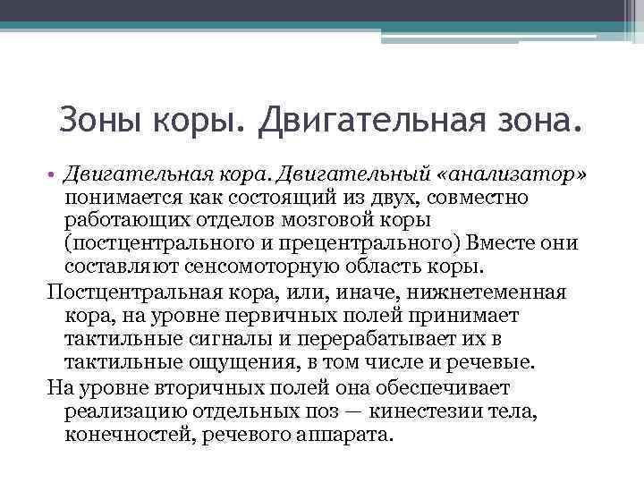 Зоны коры. Двигательная зона. • Двигательная кора. Двигательный «анализатор» понимается как состоящий из двух, совместно работающих отделов мозговой коры (постцентрального и прецентрального) Вместе они составляют сенсомоторную область коры. Постцентральная кора, или, иначе, нижнетеменная кора, на уровне первичных полей принимает тактильные сигналы и перерабатывает их в тактильные ощущения, в том числе и речевые. На уровне вторичных полей она обеспечивает реализацию отдельных поз — кинестезии тела, конечностей, речевого аппарата.