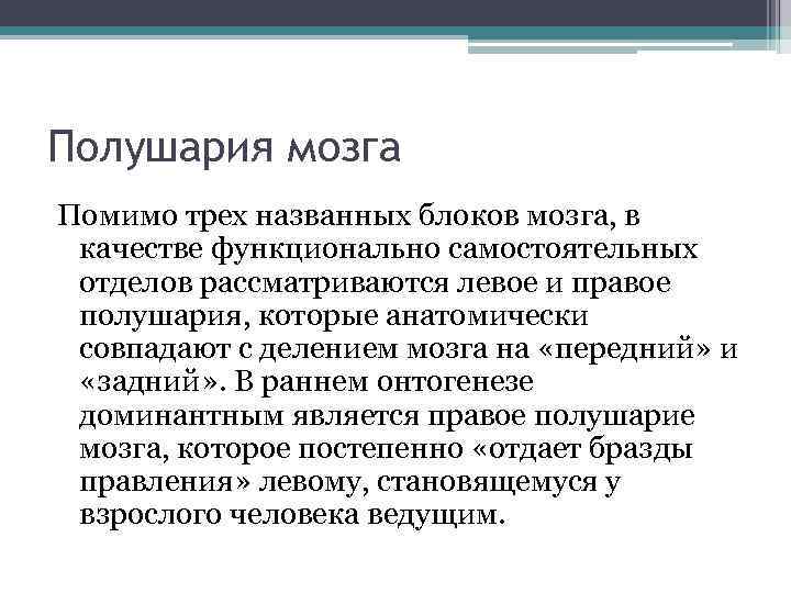 Полушария мозга Помимо трех названных блоков мозга, в качестве функционально самостоятельных отделов рассматриваются левое и правое полушария, которые анатомически совпадают с делением мозга на «передний» и «задний» . В раннем онтогенезе доминантным является правое полушарие мозга, которое постепенно «отдает бразды правления» левому, становящемуся у взрослого человека ведущим.