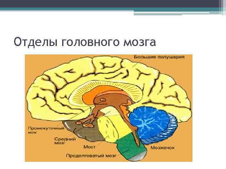Отделы головного мозга Головной мозг можно разделить на три отдела: задний, средний и передний. К заднему отделу относятся: продолговатый мозг, мост и мозжечок, а к переднему — промежуточный мозг и большие полушария.