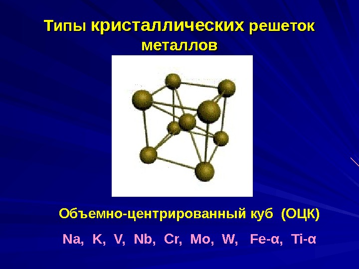 Типы кристаллических решеток металлов Объемно-центрированный куб (ОЦК) Na, K, V, Nb, Cr, Mo, W, Fe- α , Ti- α