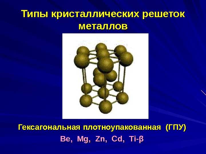 Типы кристаллических решеток металлов Гексагональная плотноупакованная (ГПУ) Be, Mg, Zn, Cd , , Ti- ββ