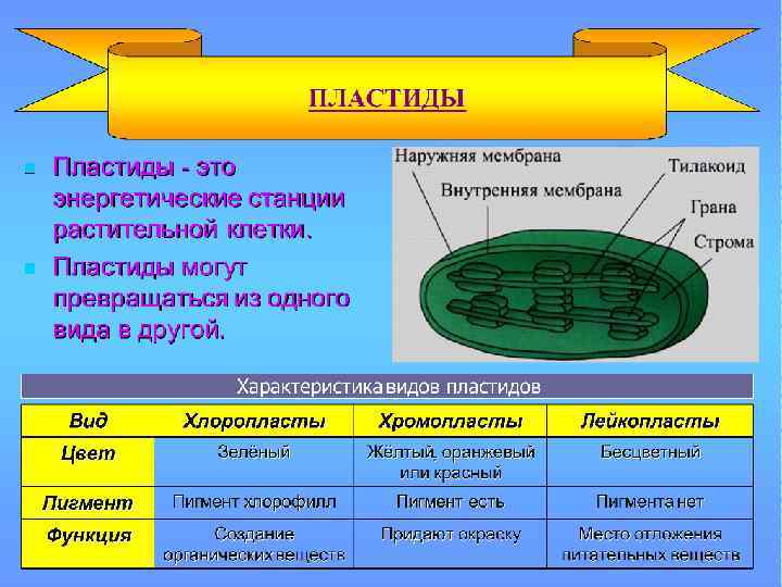 Хлоропласты l l l Хлоропла сты — зелёные пластиды, которые встречаются в клетках растений и водорослей. С их помощью происходит фотосинтез. Хлоропласты содержат хлорофилл. Под двойной мембраной имеются тилакоиды (мембранные образования, в которых находится электронтранспортная цепь хлоропластов). Тилакоиды высших растений группируются в граны, которые представляют собой стопки сплюснутых и тесно прижатых друг к другу тилакоидов, имеющих форму дисков. Соединяются граны с помощью ламелл. Пространство между оболочкой хлоропласта и тилакоидами называется стромой. На мембранах – световая фаза. В строме – реакции темповой фазы.