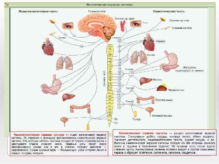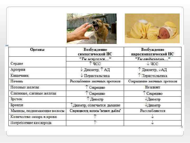СИМПАТИЧЕСКАЯ - стимулирует сердечную деятельность, повышает кровяное давление, усиливая кровоток в мышцах. Но затормаживает деятельность пищеварительной и выделительной систем (не нужные для преодоления внезапной нагрузки). Мобилизует все наличные резервы и помогает выстоять в трудной ситуации. ПАРАСИМПАТИЧЕСКАЯ - изменяет деятельность внутренних органов в противоположном направлении и отвечает за возобновление жизненно важных ресурсов организма.