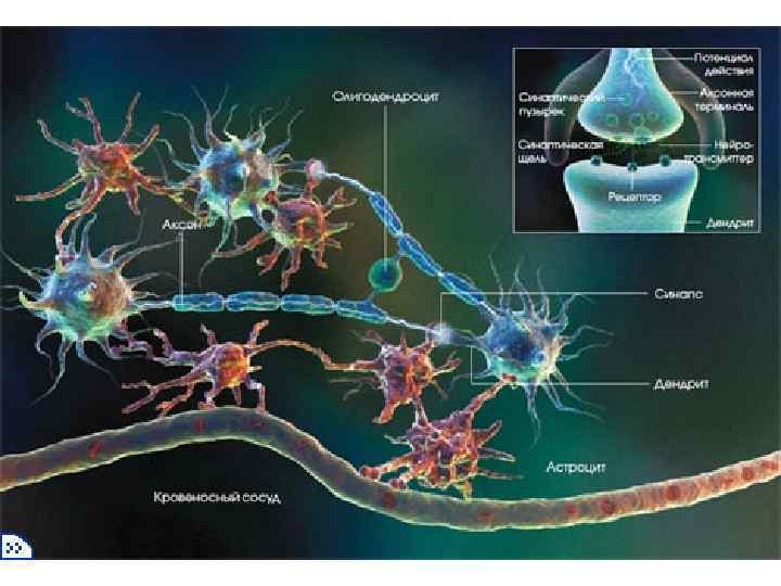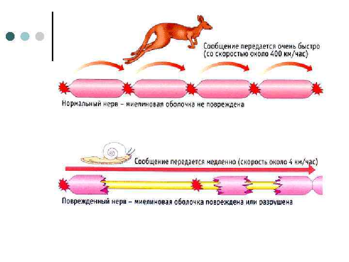 Нервные волокна Миелиновое (мякотное) Безмиелиновое (безмякотное) Скорость проведения нервного импульса безмиелиновые – 0, 3 -3 м/сядро шванновской клетки, 1 – волокно, 2 – миелиновый слой, 3 – (до 10 м/с) 4 – микротрубочки, 5 – нейрофиламенты, 6 – митохондрии, 7 – миелиновые – соединительнотканная оболочка 80 -120 м/с