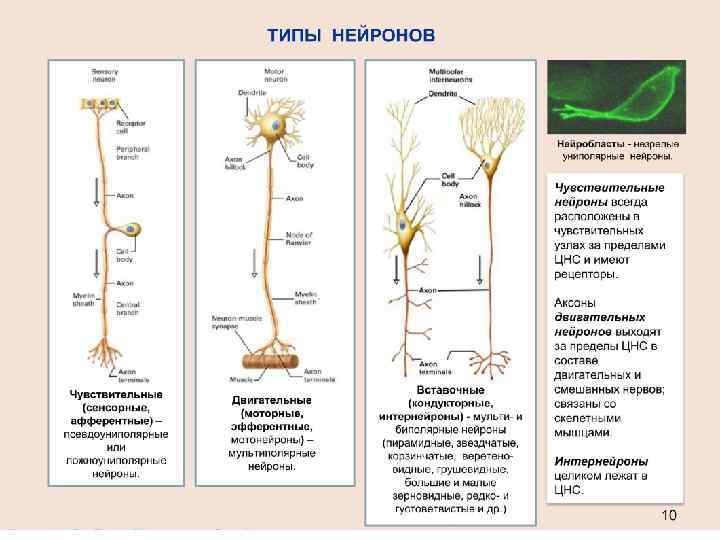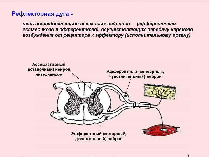1) Простая рефлекторная дуга: Рецепеторный (чувствительный) нейрон – тело в спинномозговом узле или чувствительном узле черепно-мозгового нерва. Дендрит - в коже, мышце, надкостнице или др. Аксон идет в головной или спинной мозг. Вставочный нейрон - в ЦНС Эффекторный нейрон - дендриты и тело в пределах ЦНС, а аксон достигает рабочего органа (мышцы, железы).