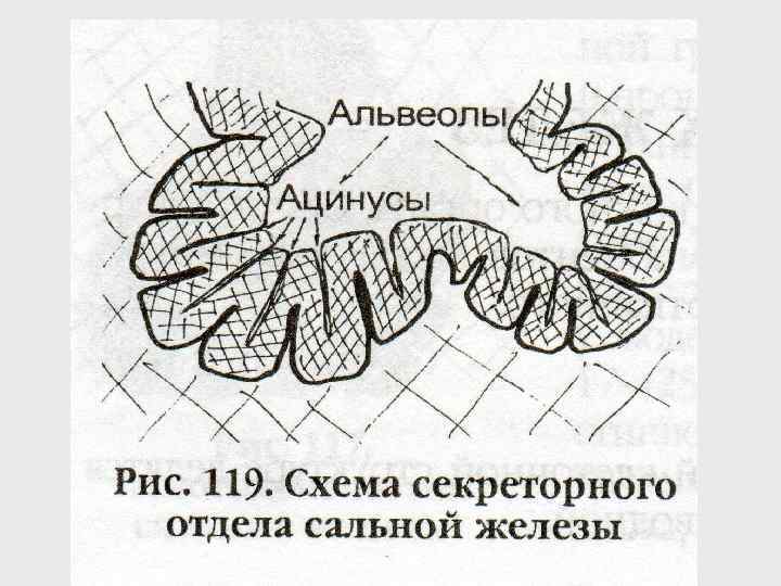 Строение сальной железы n Секреторный отдел объединяет 1 -2 дольки желез, которые состоят из альвеол, открывающихся в единый проток. n Проток сальной железы выполнен многослойным эпителием кератинизированных клеток, переходящим в эпителий наружного волосяного влагалища. Цитолемма клеток со стороны просвета имеет множество микроворсинок, а клетки с наружной стороны протока окружены базальной мембраной коллагеновых фибрилл.