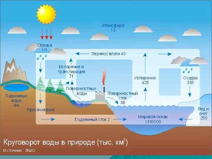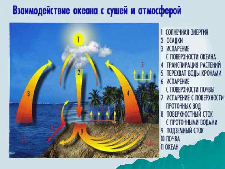 u Круговорот воды обеспечивает взаимодействие Мирового океана с атмосферой. Атмосфера защищает воды Мирового океана от сильного испарения и принимает испаряющуюся с поверхности Мирового океана влагу. Морские воздушные массы переносят тепло и влагу с океана на сушу. На побережьях океанов, где происходит постоянный перенос морской воздушной массы на сушу, формируется океанический (морской) климат.