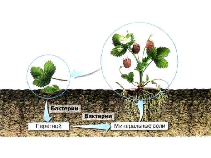 Почвенные бактерии В 1 см 3 поверхностного слоя лесной почвы содержатся сотни миллионов сапротрофных почвенных бактерий нескольких видов. Эти бактерии превращают перегной в различные минеральные вещества, которые могут быть поглощены из почвы корнями растений. Некоторые почвенные бактерии способны поглощать азот из воздуха, используя его в процессах жизнедеятельности.