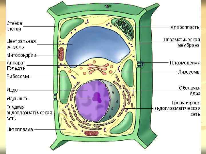 В растительных клетках присутствуют все органеллы, обнаруженные в животных клетках (за исключением центриолей). n Клеточные стенки растений состоят из целлюлозы, образующей микрофибриллы. В клетках древовидных растений слои целлюлозы пропитываются лигнином, придающим им дополнительную жёсткость. n Служат растениям опорой, предохраняют клетки от разрыва, определяют форму клетки, играют важную роль в транспорте воды и питательных веществ от клетки к клетке. Соседние клетки связаны друг с другом плазмодесмами, проходящими через мелкие поры клеточных стенок. n Вакуоль – наполненный жидкостью мембранный мешочек. n В животных клетках могут наблюдаться небольшие вакуоли, выполняющие фагоцитарную, пищеварительную, сократительную и другие функции. n Растительные клетки имеют одну большую центральную вакуоль с клеточным соком. Это концентрированный раствор сахаров, минеральных солей, органических кислот, пигментов и других веществ. n Накапливают воду, могут содержать красящие пигменты, защитные вещества (например, таннины), гидролитические ферменты, вызывающие автолиз клетки, отходы жизнедеятельности, запасные питательные вещества. n