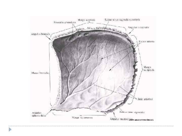 Теменная кость, парная, образует верхнебоковой отдел свода черепа. Теменная кость представляет собой равномерно изогнутую четырехугольную пластинку, выпуклую кнаружи и вогнутую изнутри. Три ее края зазубрены: лобный (передний) край, при помощи зубчатого шва соединяется с лобной костью, затылочный (задний) край, - с затылочной костью, а верхний сагиттальный край, соединяется с одноименной костью другой стороны. Четвертый чешуйчатый (нижний) край, косо срезан, прикрыт чешуей височной кости. Четырем краям соответствуют четыре угла: передне-верхний лобный угол, передненижний клиновидный угол, задневерхний затылочный угол, и задненижний сосцевидный угол. В центре выпуклой наружной поверхности теменной кости выступает теменной бугор. Несколько ниже него имеются две изогнутые верхняя и нижняя височные линии, от которых начинаются одноименные фасция и мышца. Рельеф вогнутой внутренней поверхности теменной кости обусловлен прилегающими к ней твердой оболочкой головного мозга и ее сосудами. Так, вдоль верхнего края теменной кости идет хорошо выраженная борозда верхнего сагиттального синуса. К этой борозде, соединенной с одноименной бороздой противоположной стороны, прилежит венозный (верхний сагиттальный) синус.