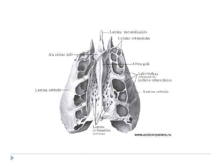 Решетчатая кость, входит в состав переднего отдела основания мозгового черепа, а также лицевого отдела черепа, участвуя в образовании стенок глазниц и носовой полости. В решетчатой кости различаю горизонтально расположенную решетчатую пластинку, от которой по средней линии отходит вниз перпендикулярная пластинка. По бокам от нее находятся решетчатые лабиринты, которые снаружи закрыты вертикально (сагиттально) расположенными правой и левой глазничными пластинками. Решетчатая пластинка, представляет собой верхнюю часть решетчатое кости; расположена в решетчатой вырезке лобной кости и участвует е образовании дна передней черепной ямки. Вся пластинка продырявлена отверстиями и напоминает решето (отсюда ее название). Через эти отверстия проходят в полость черепа обонятельные нервы (I пара черепных нервов). Над решетчатой пластинкой, по средней линии, возвышается петушиный гребень. Перпендикулярная пластинка, неправильной пятиугольной формы. Она является как бы продолжением петушиного гребня книзу, в носовую полость. В носовой полости перпендикулярная пластинка, располагаясь сагиттально, участвует в образовании верхней части перегородки носа. Решетчатый лабиринт, - парное образование. Его составляют костные воздухоносные решетчатые ячейки; сообщающиеся между собой и с полостью носа. С медиальной стороны решетчатые ячейки прикрыты двумя тонкими изогнутыми костными пластинками - верхней и средней носовыми раковинами. Верхняя часть каждой раковины прикреплена к медиальной стенке ячеек лабиринта, а нижний край свободно свисает в щель между лабиринтом и перпендикулярной пластинкой. С латеральной стороны решетчатые лабиринты прикрыты гладкой тонкой пластинкой, входящей в состав медиальной стенки глазницы, -глазничной пластинкой.
