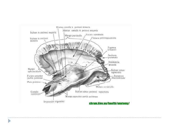 От чешуи, несколько выше и кпереди от наружного слухового отверстия, берет начало скуловой отросток. У основания скулового отростка находится нижнечелюстная ямка, для соединения с мыщелковым (суставным) отростком нижней челюсти. Спереди нижнечелюстную ямку ограничивает суставной бугорок, отделяющий ее от подвисочной ямки. На мозговой поверхности, видны пальцевидные вдавления, и артериальные борозды, - следы прилегания средней менингеальной артерии и ее ветвей. Выделяют следующие каналы височной кости: сонный канал, мышечно-трубный канал, лицевой канал, каналец барабанной струны, барабанный каналец, сосцевидный каналец, сонно-барабанные канальцы.