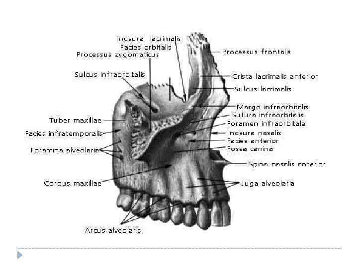 Носовая поверхность имеет сложный рельеф, участвует в образовании латеральной стенки носовой полости, соединяется с небной костью, нижней носовой раковиной и книзу переходит в верхнюю поверхность небного отростка верхней челюсти. На этой поверхности видна треугольной формы верхнечелюстная расщелина, впереди которой имеется хорошо выраженная вертикально расположенная слезная борозда. Последняя, срастаясь со слезной костью и нижней носовой раковиной, участвует в формировании носослезного канала. Впереди этой борозды поперек основания лобного отростка идет раковинный гребень, к которому прикрепляется нижняя носовая раковина. Лобный отросток, отходит от тела верхней челюсти в том месте, где сходятся передняя, носовая и глазничная поверхности. Верхним зазубренным концом лобный отросток достигает носовой части лобной кости. На латеральной поверхности отростка отвесно проходит передний слезный гребень, продолжающийся внизу в подглазничный край, который вместе с лобным отростком ограничивает спереди слезную борозду. На медиальной поверхности лобного отростка имеется решетчатый гребень, с ним срастается передняя часть средней носовой раковины решетчатой кости. Скуловой отросток отходит от верхнелатеральной части тела верхней челюсти. Своим зазубренным концом соединяется со скуловой костью. Альвеолярный отросток представляет собой толстую пластинку, выпуклую кпереди и вогнутую сзади, отходящую от тела верхней челюсти вниз. Небный отросток имеет вид горизонтальной пластинки. Начинается от носовой поверхности тела верхней челюсти, у места перехода его в альвеолярный отросток.