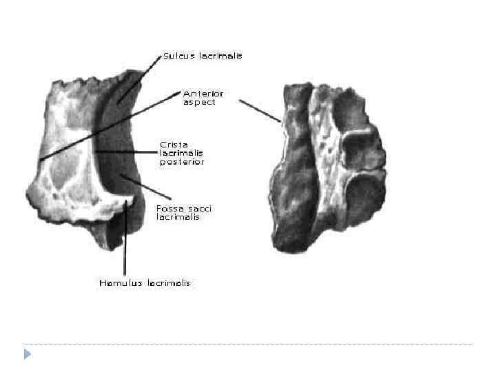 Слезная кость, - парная, очень тонкая и хрупкая четырехугольная пластинка. Образует переднюю часть медиальной стенки глазницы. Спереди слезная кость соединяется с лобным отростком верхней челюсти, сзади - с глазничной пластинкой решетчатой кости, вверху - с медиальным краем глазничной части лобной кости. Медиальная поверхность слезной кости прикрывает с латеральной стороны передние ячейки решетчатой кости. На латеральной поверхности слезной кости имеется задний слезный гребень, заканчивающийся внизу слезным крючком. Впереди от слезного гребня проходит слезная борозда, которая с такой же бороздой верхней челюсти образует ямку слезного мешка.