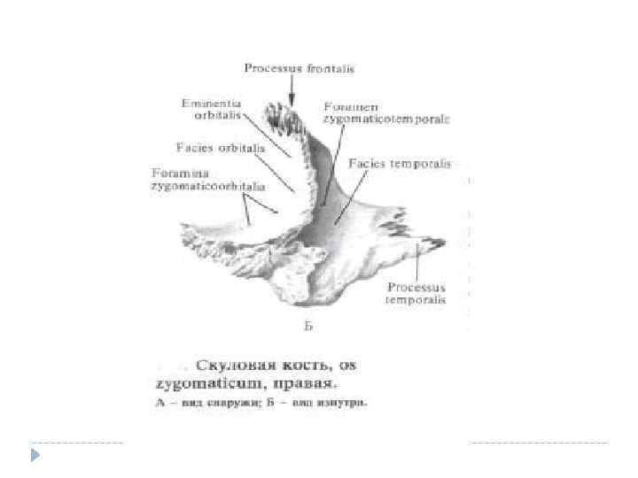 Скуловая кость, парная, соединяется с соседними костями мозгового и лицевого отделов черепа (лобной, височной и верхней челюстью), укрепляя лицевой отдел: В скуловой кости различают латеральную, височную и глазничную поверхности и два отростка: лобный и височный. Латеральная поверхность, неправильной четырехугольной формы, обращена латерально и вперед, немного выпуклая. Височная поверхность, гладкая, составляет переднюю стенку подвисочной ямки. Глазничная поверхность, образует латеральную стенку глазницы и латеральную часть подглазничного края. На глазничной поверхности находится скулоглазничное отверстие. Оно ведет в канал, который в толще кости раздваивается и открывается наружу двумя отверстиями: на латеральной поверхности кости - скулолицевое отверстие, на височной поверхности скуловисочное отверстие. Лобный отросток, отходит от скуловой кости вверх, где соединяется со скуловым отростком лобной кости и с большим крылом клиновидной кости (в глубине глазницы). Височный отросток, направляется назад. Вместе со скуловым отростком височной кости он образует скуловую дугу, ограничивающую с латеральной стороны височную ямку. С верхней челюстью скуловая кость соединяется при помощи обширной зазубренной площадки.