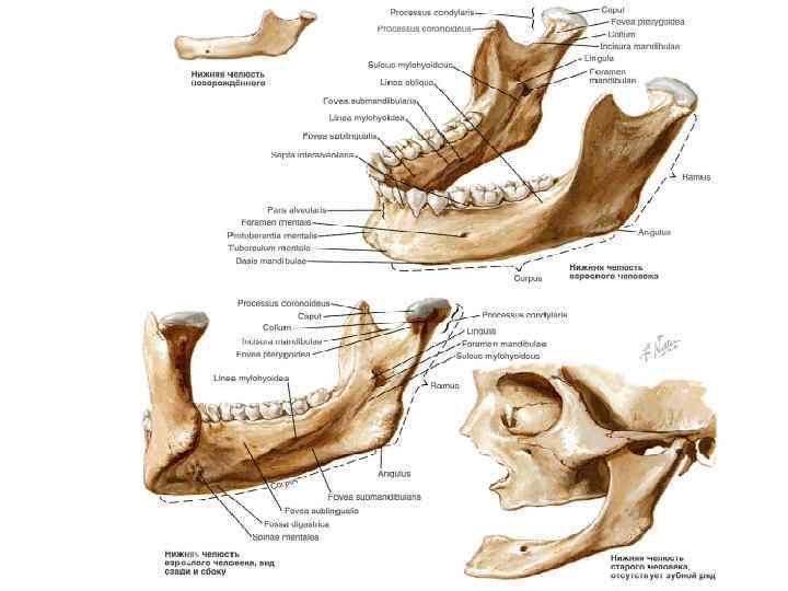 На середине внутренней поверхности тела нижней челюсти выступает подбородочная кость. По бокам от нее у основания челюсти справа и слева определяется продолговатая двубрюшная ямка - место прикрепления одноименных мышц. У верхнего края ости, ближе к зубным альвеолам, также с двух сторон располагается подъязычная ямка, для одноименной слюнной железы. Под ней начинается и уходит косо вверх, заканчиваясь у заднего конца тела нижней челюсти, слабо выраженная челюстно-подъязычная линия. Под этой линией на уровне коренных зубов находится поднижнечелюстная ямка, - место прилегания поднижнечелюстной слюнной железы. Ветвь нижней челюсти, парная, отходит от тела под тупым углом вверх, имеет передний и задний края и две поверхности, наружную и внутреннюю. При переходе тела в задний край ветви образуется угол нижней челюсти, на наружной поверхности которого имеется жевательная бугристость, а на внутренней - крыловидная бугристость. Несколько выше последней на внутренней поверхности ветви видно довольно крупное, обращенное кверху и кзади отверстие нижней челюсти, которое с медиальной стороны ограничено язычком нижней челюсти. Это отверстие ведет в канал нижней челюсти, который проходит внутри тела нижней челюсти и заканчивается на его наружной поверхности подбородочным отверстием. На внутренней поверхности ветви нижней челюсти, несколько кзади от язычка, спускается косо вниз и вперед челюстноподъязычная борозда, к которой прилежат одноименные нерв и сосуды.