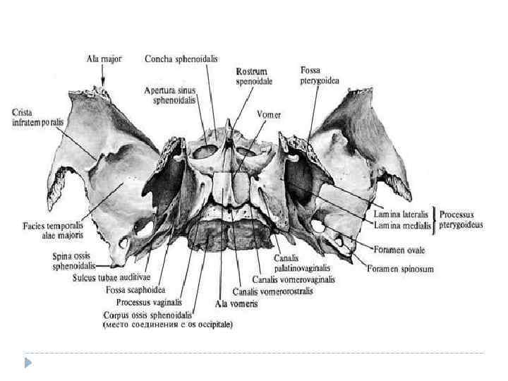 Клиновидная кость, находится в центре основания черепа. Она участвует в образовании боковых стенок свода черепа, а также полостей и ямок мозгового и лицевого отделов черепа. Клиновидная кость имеет сложную форму и состоит из тела, от которого отходят 3 пары отростков: большие крылья, малые крылья и крыловидные отростки. Тело, клиновидной кости имеет форму неправильного куба. Внутри него находится полость - клиновидная пазуха. В теле различают 6 поверхностей: верхнюю, или мозговую; заднюю, сращенную у взрослых с базилярной (основной) частью затылочной кости; переднюю, переходящую без резких границ в нижнюю, и две боковые. На верхней (мозговой) поверхности заметно углубление - турецкое седло. В центре его имеется гипофизарная ямка, в которой помещается гипофиз. Впереди от углубления находится поперечно лежащий бугорок седла. Передняя поверхность тела клиновидной кости вытянута в небольшой клиновидный гребень. Последний продолжается на нижнюю поверхность в виде острого клиновидного клюва (киля), клиновидный гребень передним краем соединяется с перпендикулярной пластинкой решетчатой кости. Боковые поверхности тела клиновидной кости кпереди и книзу продолжаются в малые и большие крылья. Крыловидный отросток, парный, отходит от тела клиновидной кости у места начала большого крыла и направляется вертикально вниз. Медиальная пластинка отростка обращена в сторону носовой полости, латеральная в подвисочную ямку. Основание отростка пронизывает спереди назад узкий Крыловидный канал, в котором проходят сосуды и нервы. Переднее отверстие этого канала открывается в крыловидно-небную ямку, заднее - на наружном основании черепа вблизи ости клиновидной кости. Выделяются пластинки крыловидного отростка: медиальная, и латеральная.