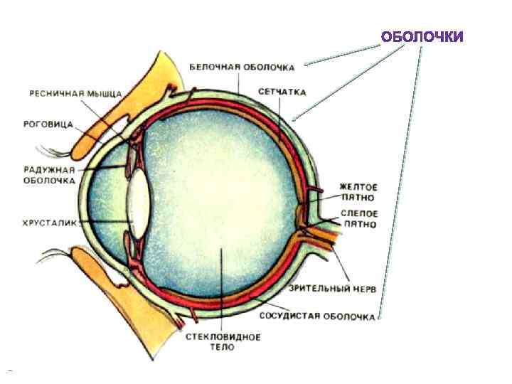 Орган зрения состоит из глазного яблока и вспомогательного аппарата(веки, глазодвигательные мышцы, слезные железы). Глазное яблоко ядро три оболочки фиброзная сосудистая сетчатка