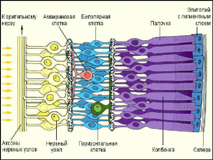 2. Средний ассоциативный слой представлен биполярными клетками, контактирующими с клетками 3 слоя. Функция: биполярным клеткам передают зрительные импульсы аксоны палочек и колбочек.