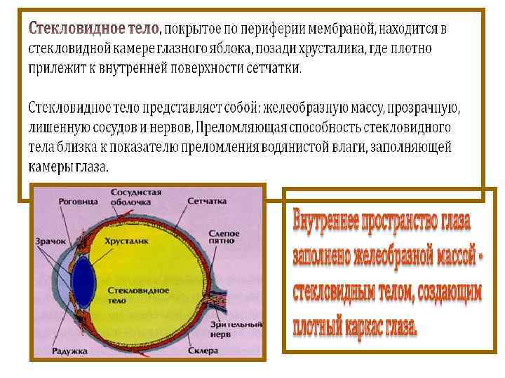 Ядро глазного яблока содержит: а) хрусталик – прозрачная двояковыпуклая линза, находящаяся позади радужки. Сосудов и нервов не имеет. Вещество хрусталика прозрачное, бесцветное, плотное Функция: преломляющая сила хрусталика обеспечена сокращением ресничной мышцы. б) водянистая влага находится, в передней и задней камерах, которые сообщаются между собой при помощи зрачка. Влага выделяется кровеносными сосудами ресничных отростков. в) стекловидное тело – заполняет всю полость глазного яблока между сетчаткой сзади и хрусталиком спереди. Это студенистообразное вещество, не имеющее кровеносных сосудов.