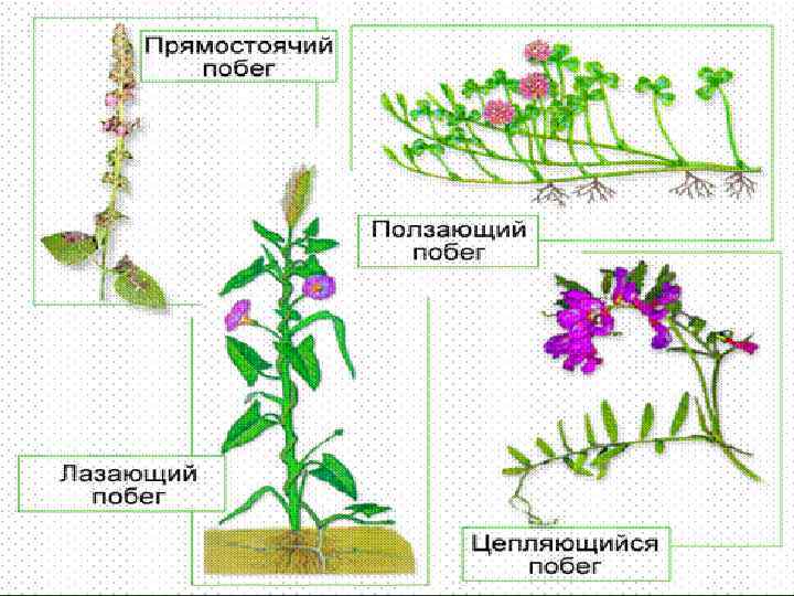 Название побегов Особенности строения 1. Прямостоящие Растут вертикально вверх, не нуждаются в опоре 2. Ползучие Стелются по земле и укореняются при помощи придаточных корней 3. Приподнимающиеся Основания побегов занимают горизонтальное положение, а верхняя часть - вертикальное 4. Цепляющиеся Поднимаются вверх, прикрепляясь к опоре усиками или корнямиприцепками 5. Вьющиеся Обвиваются вокруг опоры Примеры растений