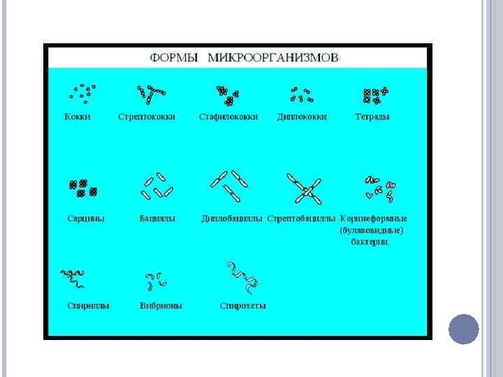 РАССМОТРИТЕ ВНИМАТЕЛЬНО РИСУНКИ И ВСПОМНИТЕ: КАКИЕ РАЗЛИЧАЮТ ФОРМЫ БАКТЕРИЙ? Размеры — от 1 до 15 мкм. Основные формы: 1) кокки (шаровидные), 2) бациллы (палочковидные), 3) вибрионы (изогнутые в виде запятой), 4) спириллы и спирохеты (спирально закрученные).