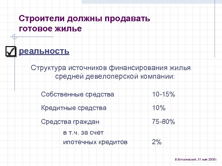 Строители должны продавать готовое жилье реальность Структура источников финансирования жилья средней девелоперской компании: Собственные средства 10 -15% Кредитные средства 10% Средства граждан 75 -80% в т. ч. за счет ипотечных кредитов 2% В. Вотолевский, 31 мая 2005 г.