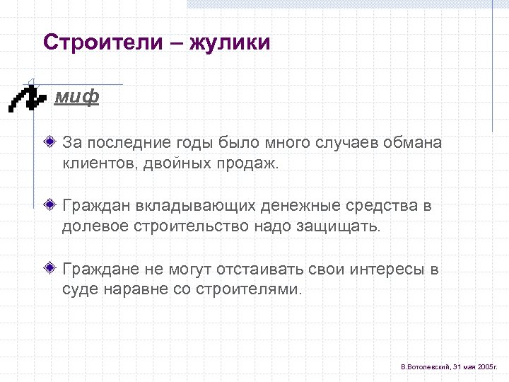 Строители – жулики миф За последние годы было много случаев обмана клиентов, двойных продаж. Граждан вкладывающих денежные средства в долевое строительство надо защищать. Граждане не могут отстаивать свои интересы в суде наравне со строителями. В. Вотолевский, 31 мая 2005 г.