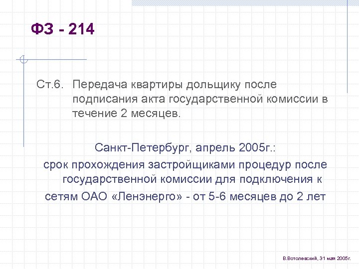 ФЗ - 214 Ст. 6. Передача квартиры дольщику после подписания акта государственной комиссии в течение 2 месяцев. Санкт-Петербург, апрель 2005 г. : срок прохождения застройщиками процедур после государственной комиссии для подключения к сетям ОАО «Ленэнерго» - от 5 -6 месяцев до 2 лет В. Вотолевский, 31 мая 2005 г.
