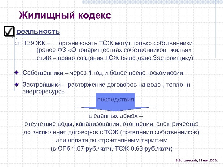 Жилищный кодекс реальность ст. 139 ЖК – организовать ТСЖ могут только собственники (ранее ФЗ «О товариществах собственников жилья» ст. 48 – право создания ТСЖ было дано Застройщику) Собственники – через 1 год и более после госкомиссии Застройщики – расторжение договоров на водо-, тепло- и энергоресурсы последствия в сданных домах – отсутствие воды, канализования, отопления, электричества до заключения договоров с ТСЖ (появления собственников) или оплата по строительным тарифам (в СПб 1, 07 руб. /квтч, ТСЖ-0, 63 руб. /квтч) В. Вотолевский, 31 мая 2005 г.