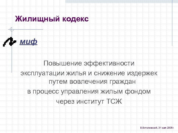 Жилищный кодекс миф Повышение эффективности эксплуатации жилья и снижение издержек путем вовлечения граждан в процесс управления жилым фондом через институт ТСЖ В. Вотолевский, 31 мая 2005 г.